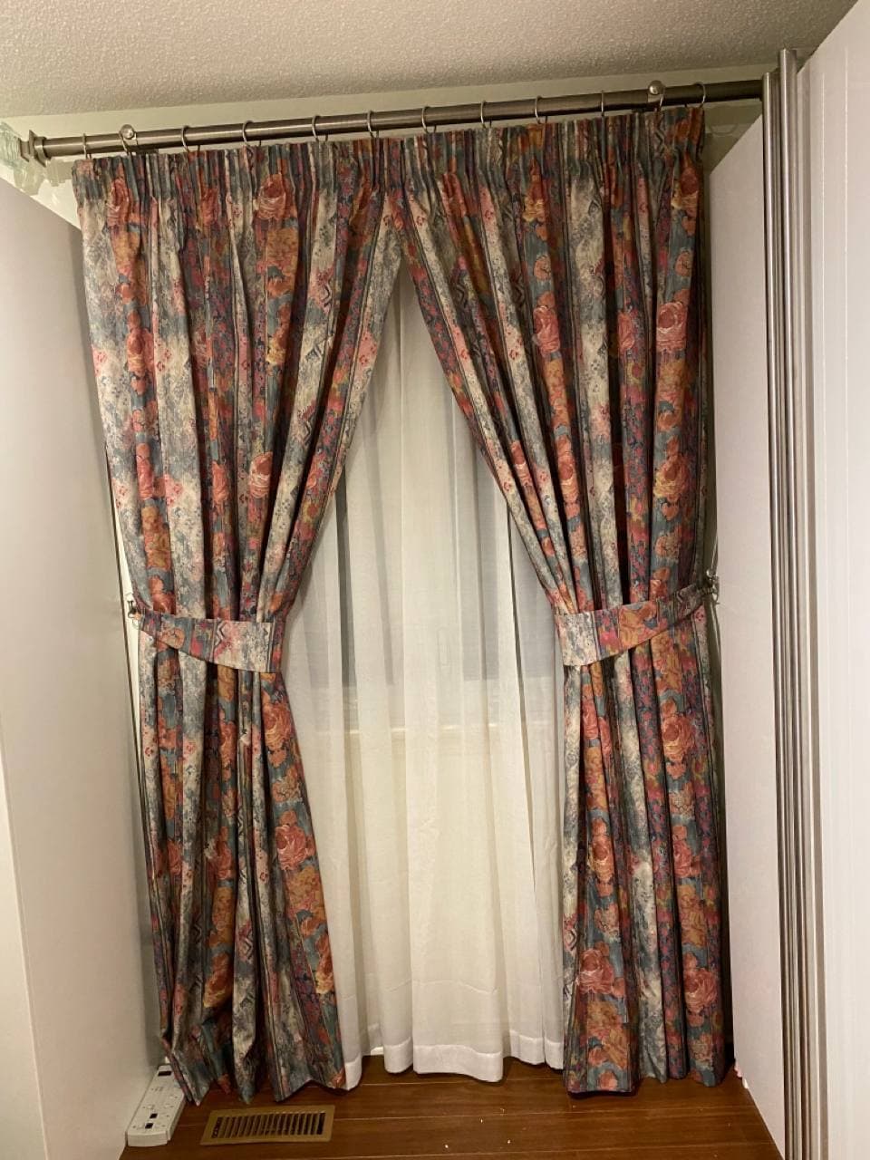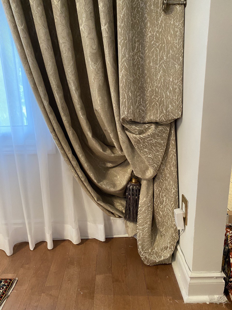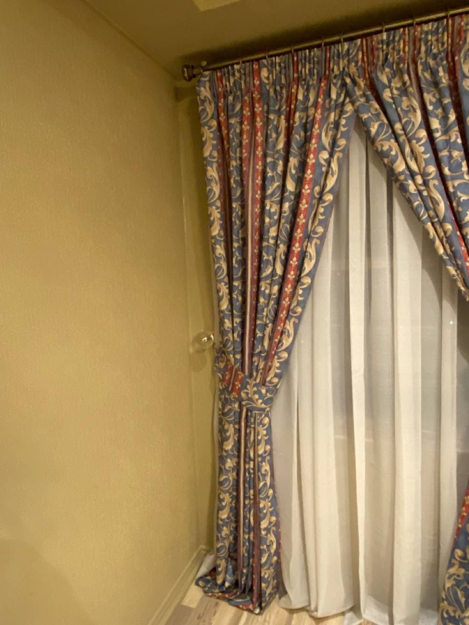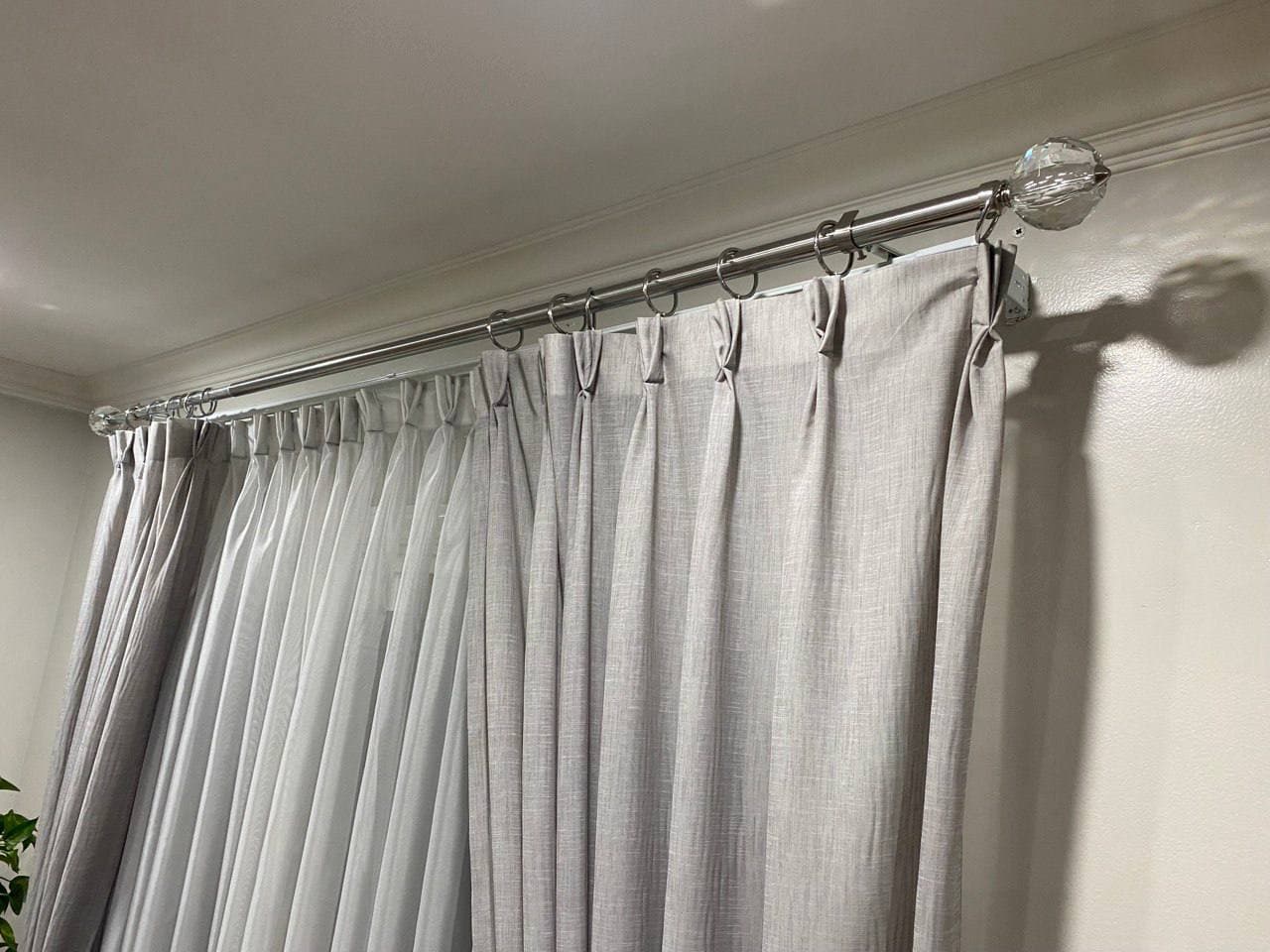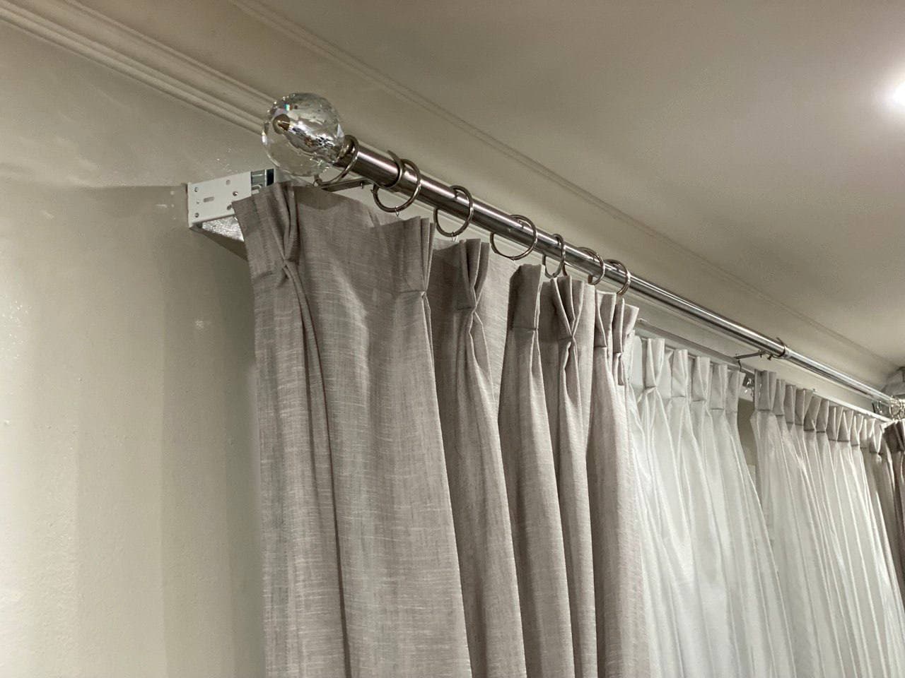 Curtains may be held back with tie-backs (a loop of cloth, cord, etc., placed around a curtain to hold it open to one side; typically passed through a ring on a hook attached to the wall, and fastened with a knot, button, or velcro; often adorned with tassels) or may be closed and opened with sticks called draw-pulls (rods made of plastic, wood, or metal that can be twisted and/or pulled) or curtain rods which are attached either to the runner or to the first hook. A curtain hook stopper is a device used to stop the curtain from falling off the end of the curtain rail.