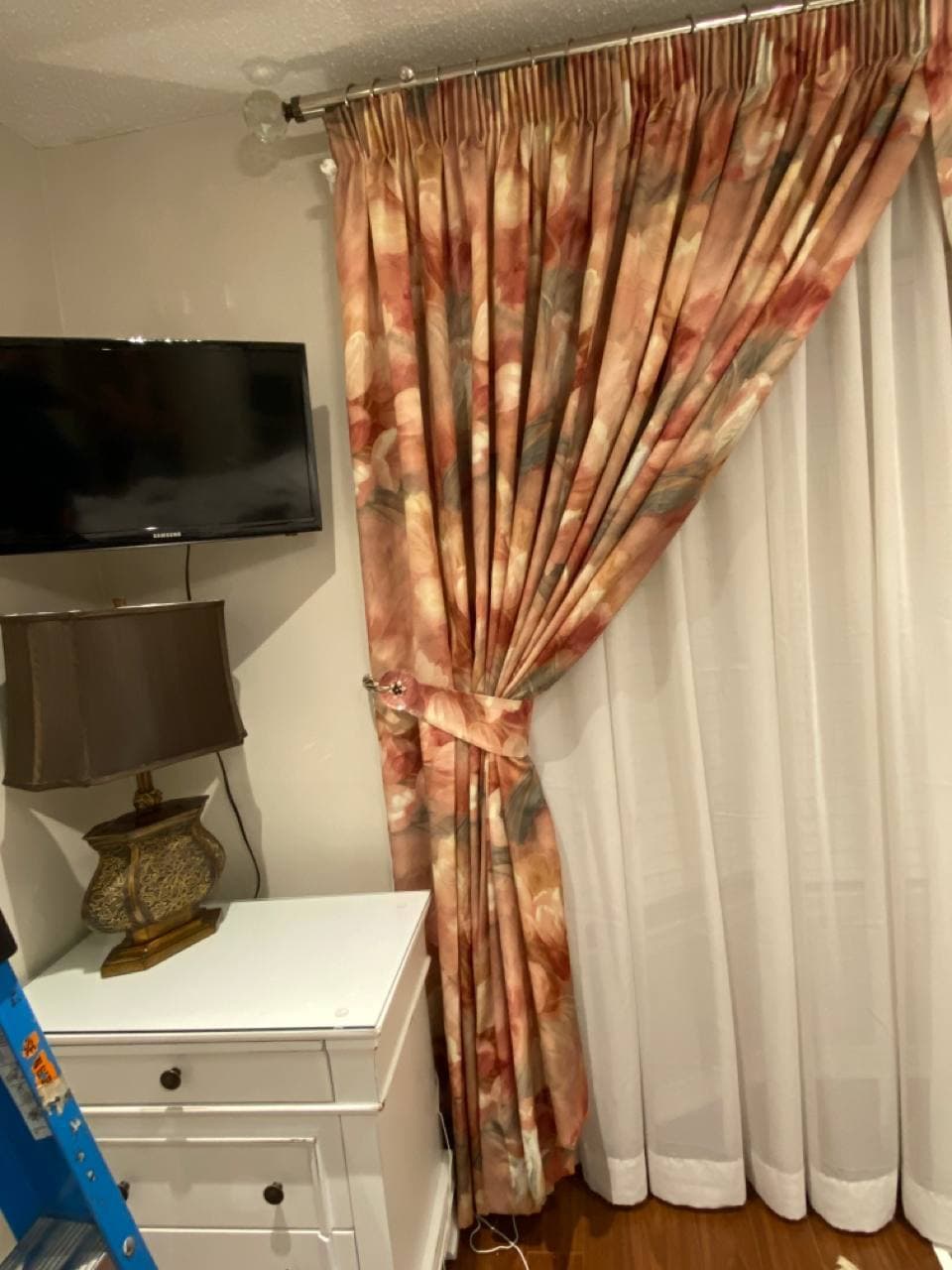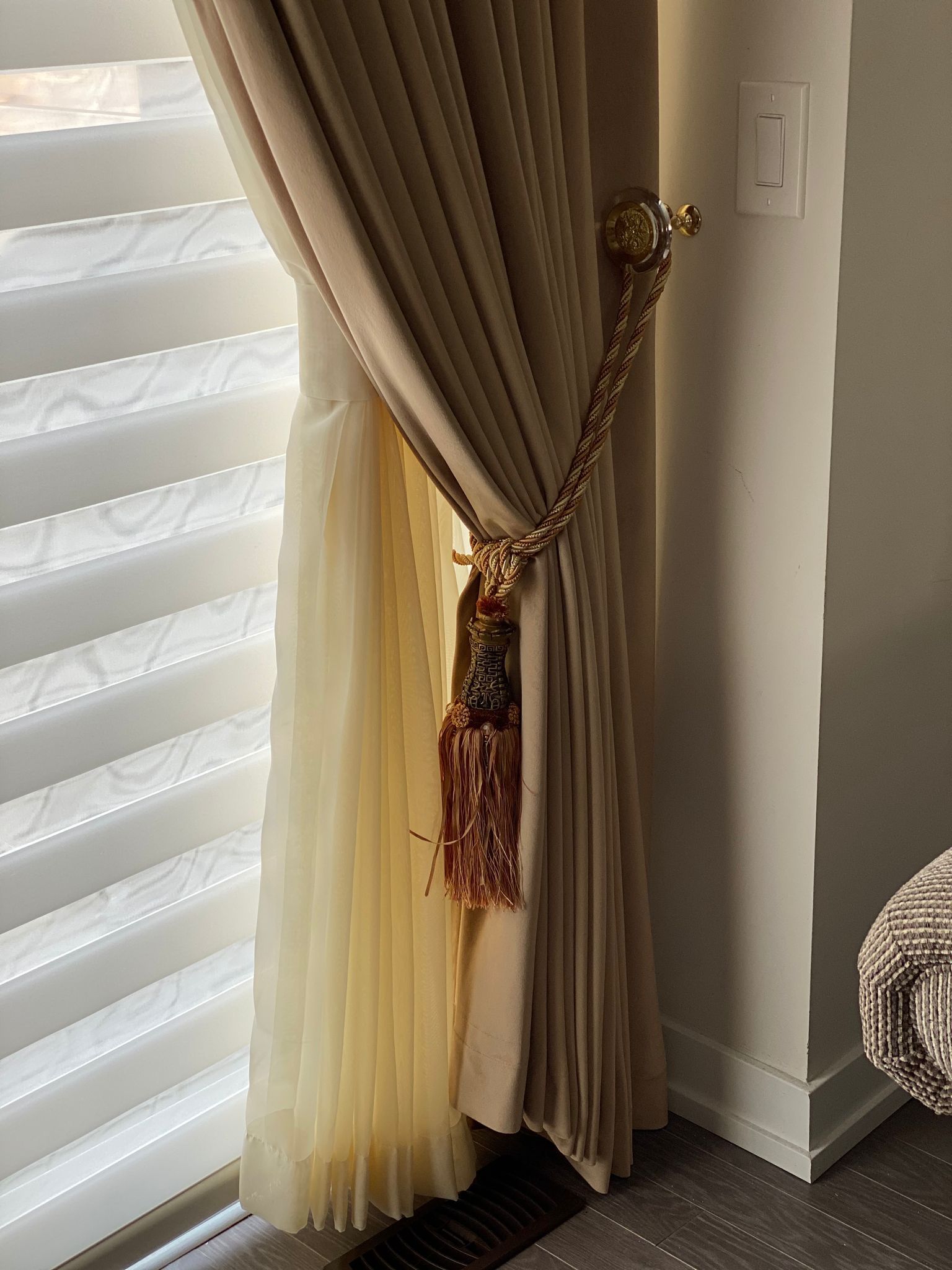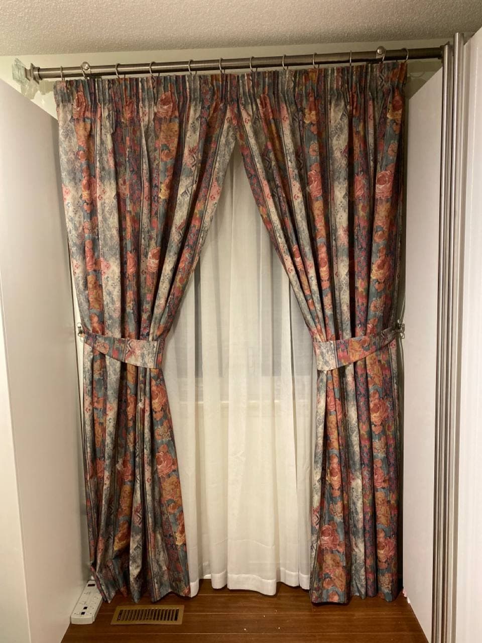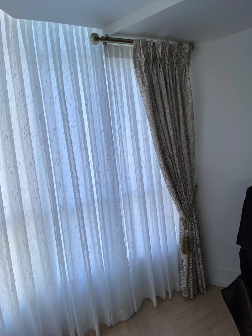 Curtains may be held back with tie-backs (a loop of cloth, cord, etc., placed around a curtain to hold it open to one side; typically passed through a ring on a hook attached to the wall, and fastened with a knot, button, or velcro; often adorned with tassels) or may be closed and opened with sticks called draw-pulls (rods made of plastic, wood, or metal that can be twisted and/or pulled) or curtain rods which are attached either to the runner or to the first hook. A curtain hook stopper is a device used to stop the curtain from falling off the end of the curtain rail.
