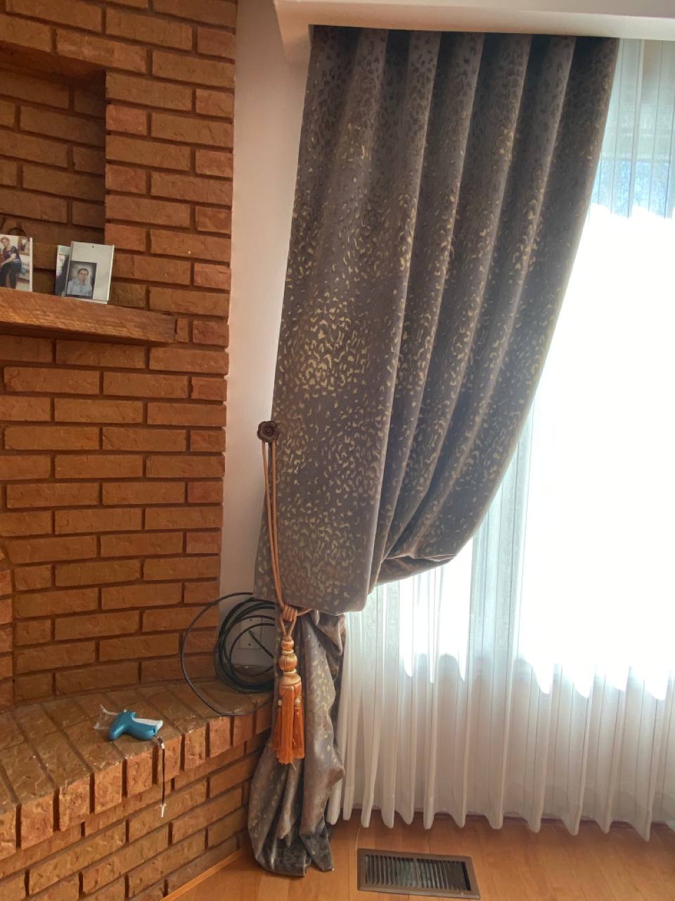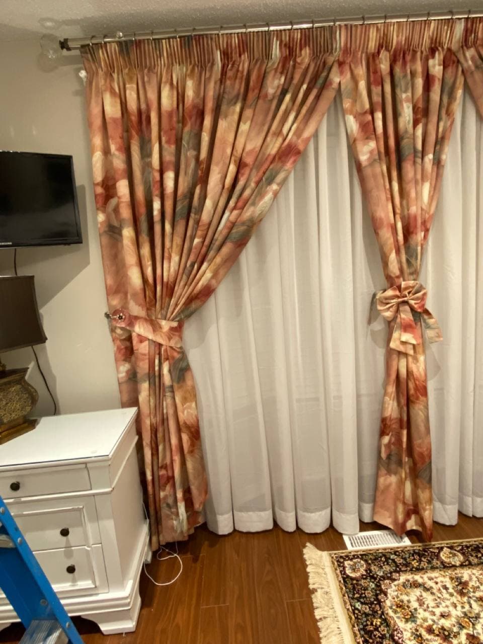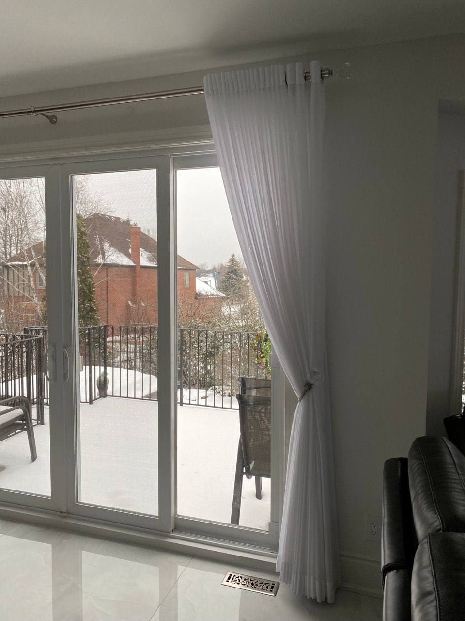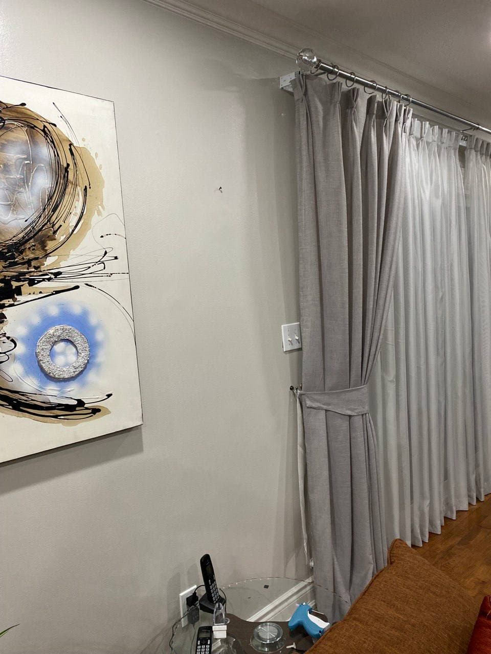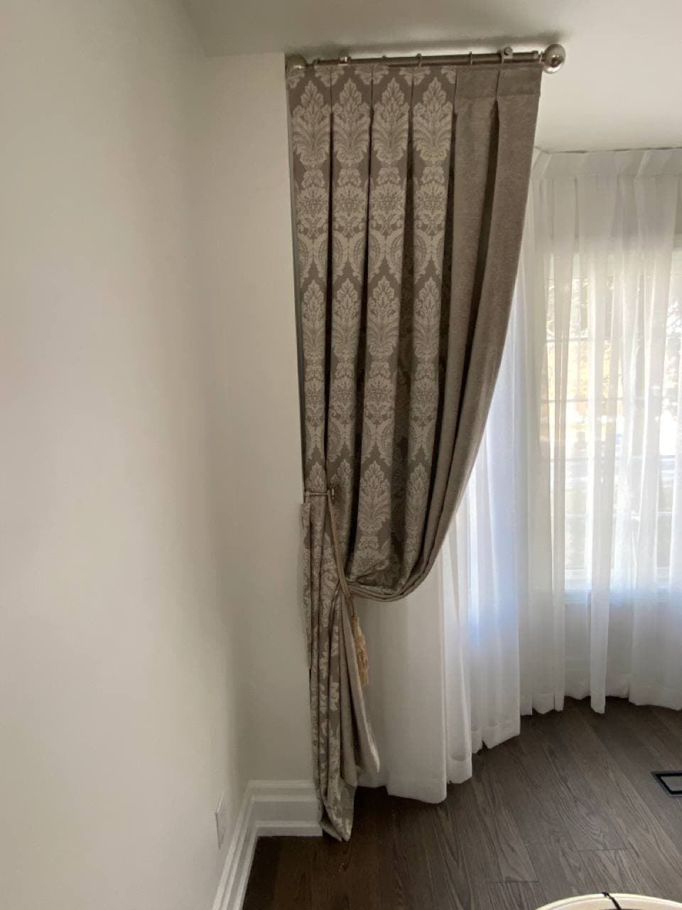 Curtains may be held back with tie-backs (a loop of cloth, cord, etc., placed around a curtain to hold it open to one side; typically passed through a ring on a hook attached to the wall, and fastened with a knot, button, or velcro; often adorned with tassels) or may be closed and opened with sticks called draw-pulls (rods made of plastic, wood, or metal that can be twisted and/or pulled) or curtain rods which are attached either to the runner or to the first hook. A curtain hook stopper is a device used to stop the curtain from falling off the end of the curtain rail.