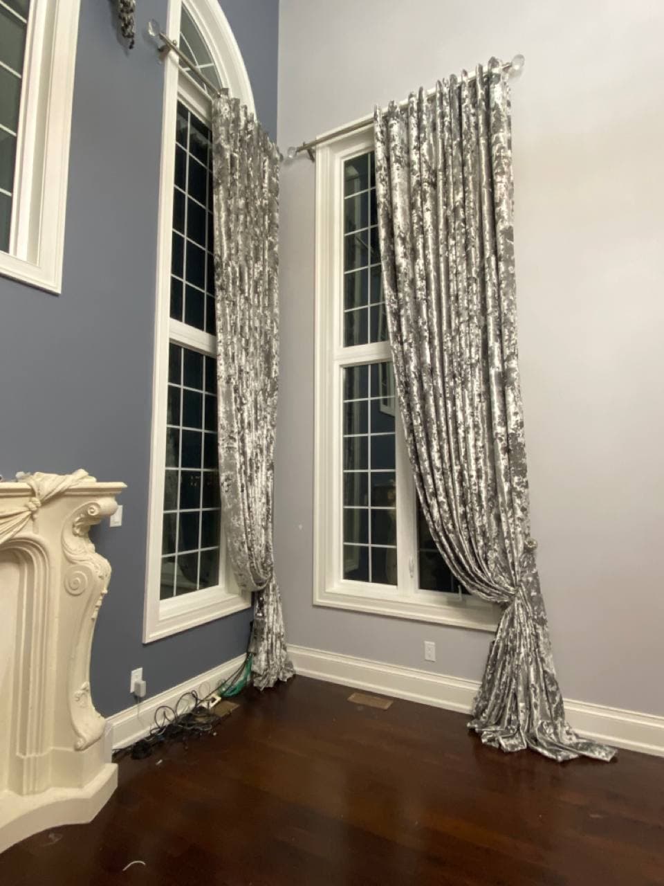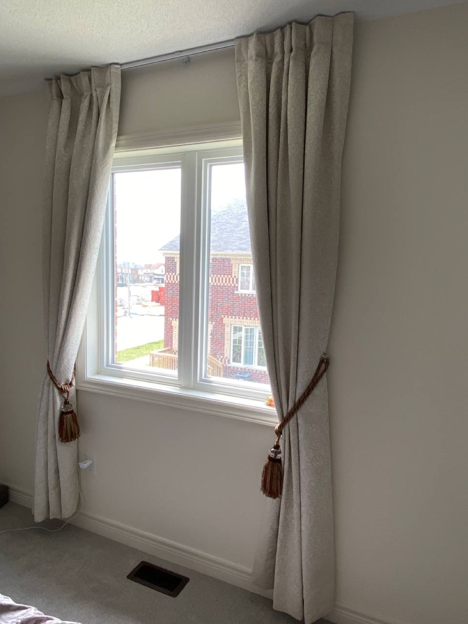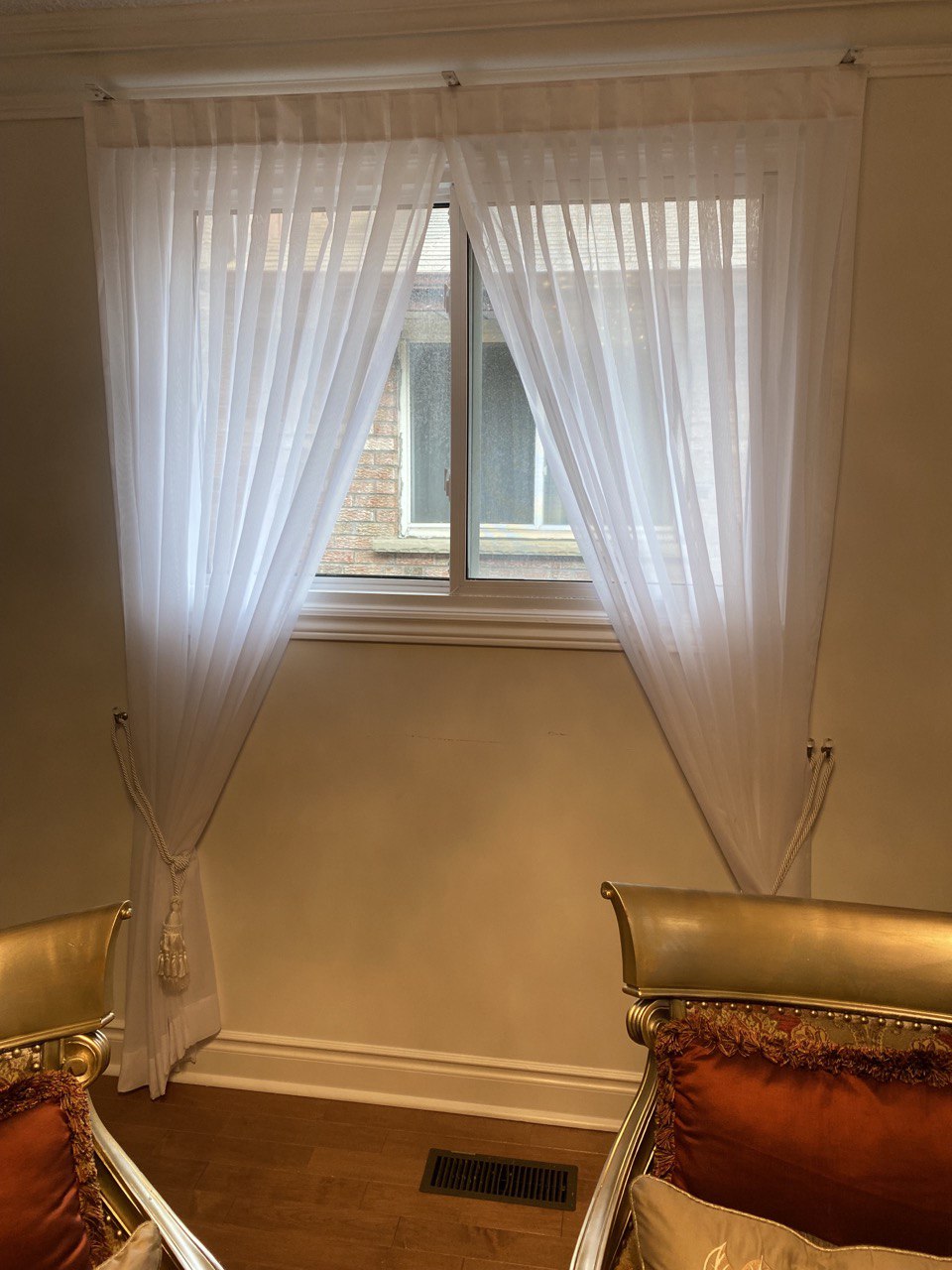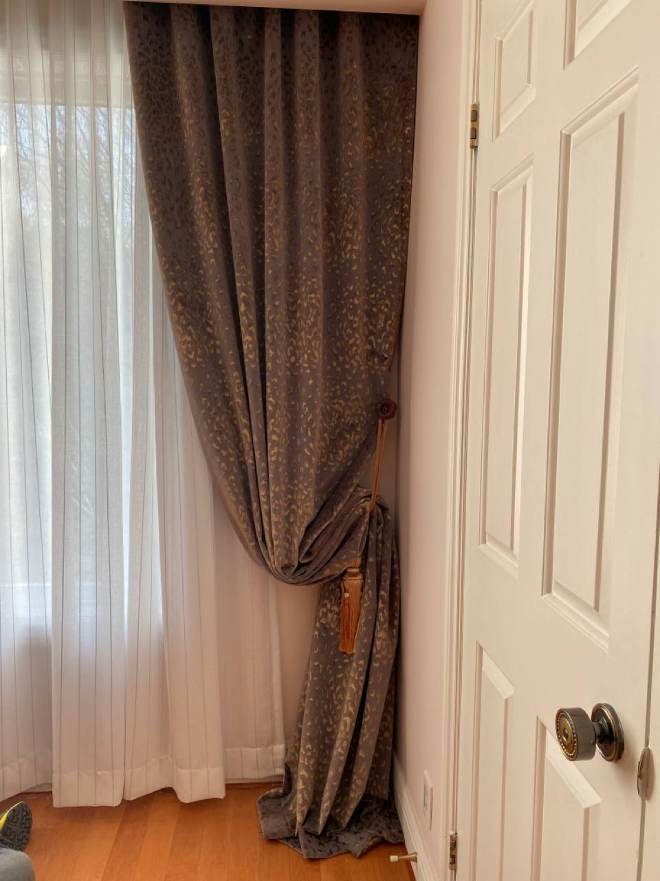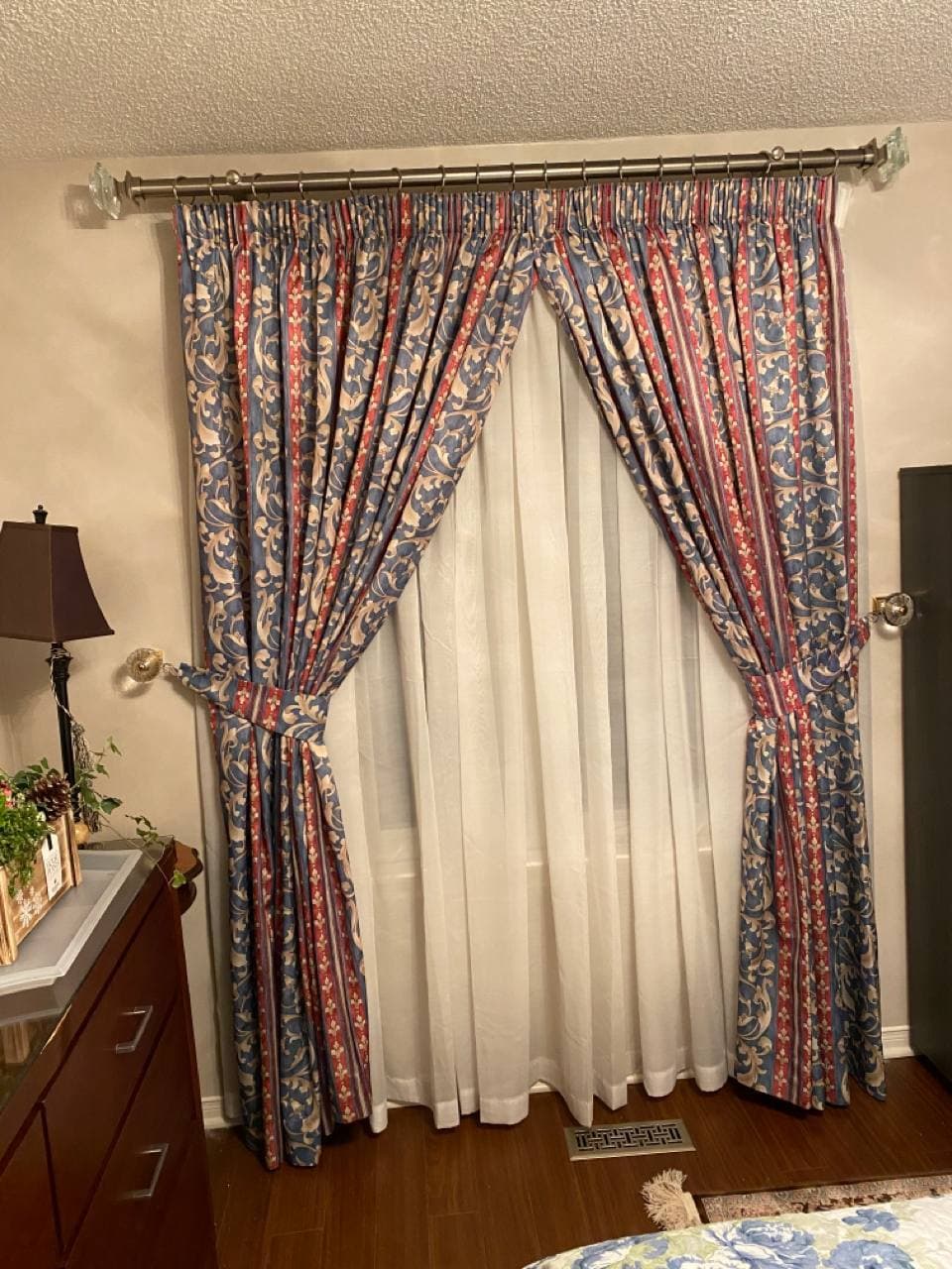 Curtains may be held back with tie-backs (a loop of cloth, cord, etc., placed around a curtain to hold it open to one side; typically passed through a ring on a hook attached to the wall, and fastened with a knot, button, or velcro; often adorned with tassels) or may be closed and opened with sticks called draw-pulls (rods made of plastic, wood, or metal that can be twisted and/or pulled) or curtain rods which are attached either to the runner or to the first hook. A curtain hook stopper is a device used to stop the curtain from falling off the end of the curtain rail.